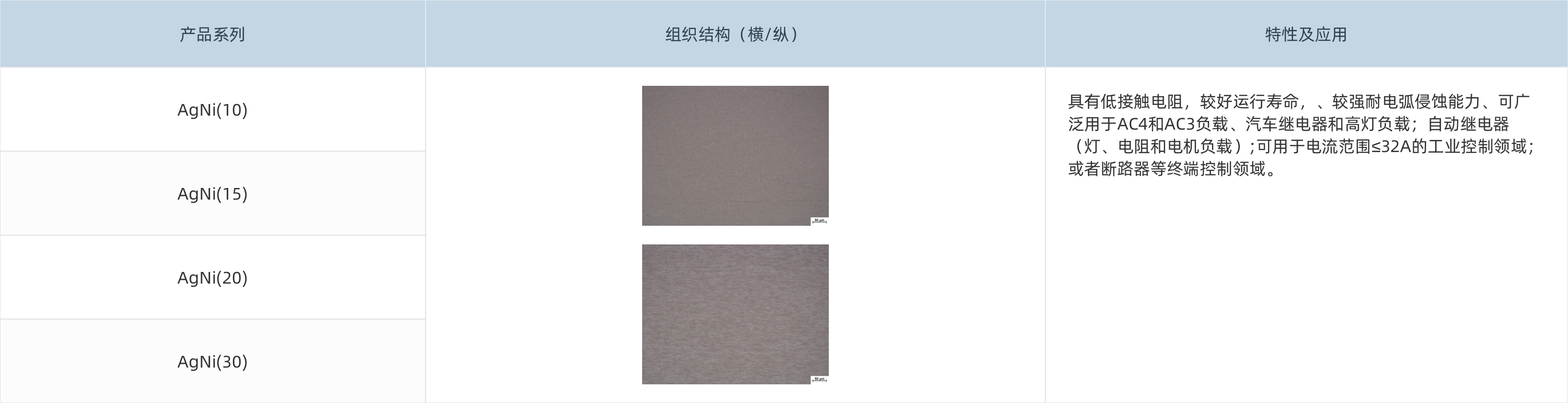 AgNi材料導電、導熱性能好,接觸電阻低而穩(wěn)定,中小電流下抗熔焊能力及耐電弧侵蝕性能良好,直流條件下抗材料轉移能力較強;中大電流條件下,AgNi材料的抗熔焊性能較差,但與AgC等材料配對使用可彌補抗熔焊性能差的缺點。